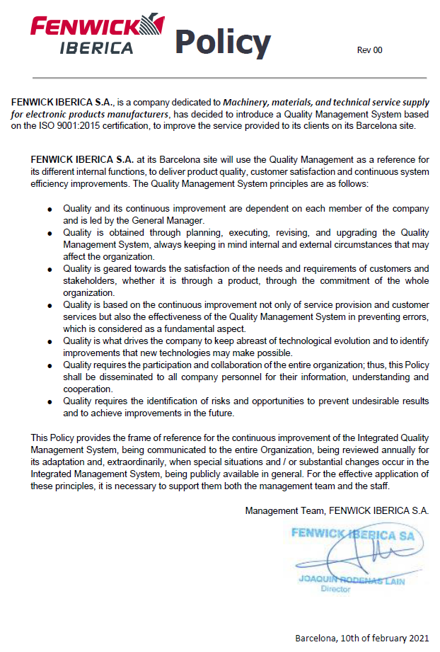 Fenwick Ibérica ha sido certificada en el Sistema de Gestión de Calidad ISO9001:2015. Esta certificación nos permitirá acreditar y fortalecer el proceso de mejora continua en nuestros procesos internos, nuestros servicios y en los productos suministrados a nuestros clientes.
